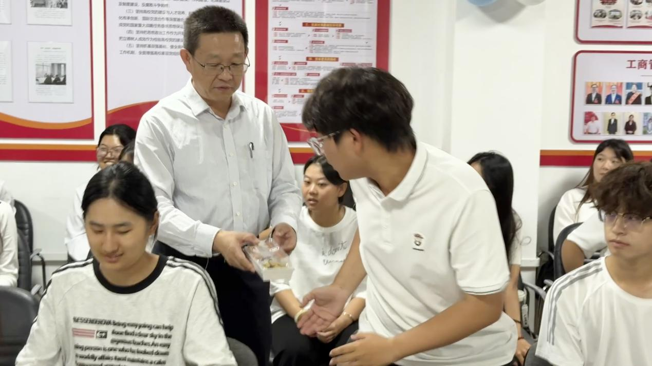 活动尾声,唐勋书记走到同学们中间,为现场每一位学生送上月饼。香甜月饼承载团圆寓意与学校关怀,让同学们真切感受工商管理系“大家庭”的暖心氛围。