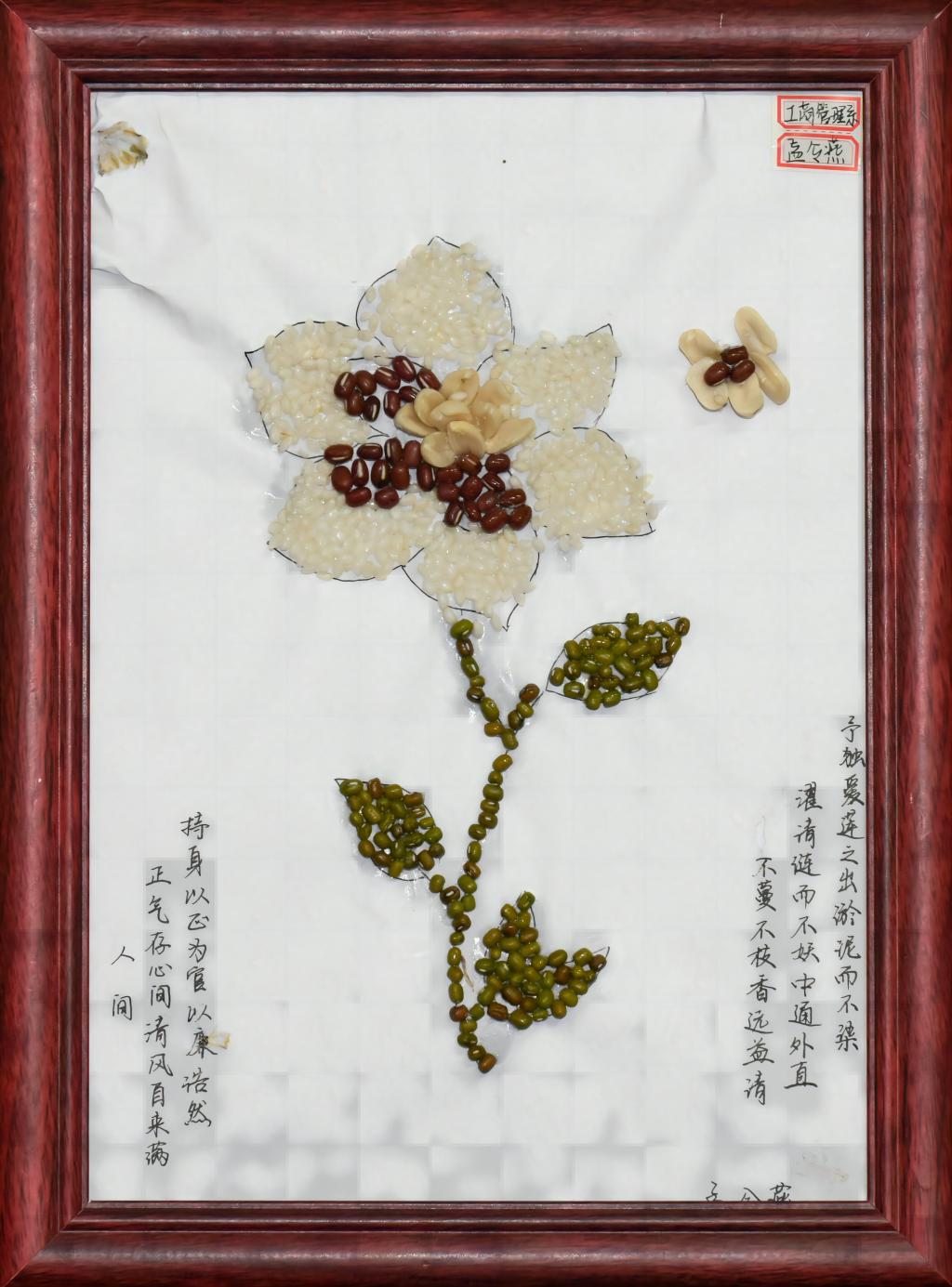 本作品以“廉”字为核心构图:在画面中心用五谷杂粮拼出一个大大的“廉”字,比如用饱满的五谷勾勒出“廉”字的轮廓,内部则用谷类填充,使“廉”字醒目且富有质感,寓意着廉洁是一种珍贵的品质,需要像对待粮食一样珍惜和坚守。(作者 孟令燕)