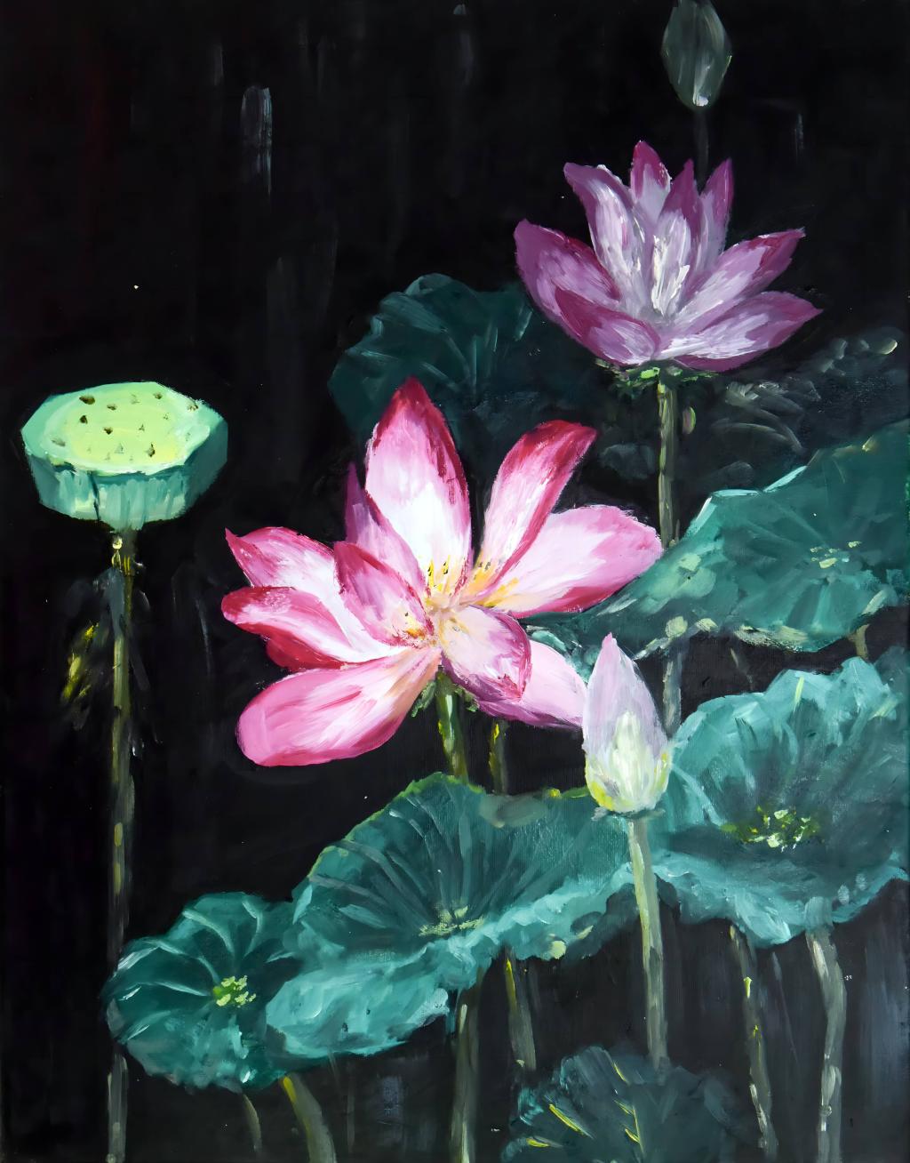 本作品是一幅以莲花为主题的油画。在深邃如墨玉的绿色背景中,圣洁的莲花悠然盛放,以其静谧的光华破开沉郁,宛若夜空中一首清亮的诗篇。饱满的笔触与细腻的色层,勾勒出花瓣的柔韧与挺拔,既有“出淤泥”的深沉力量,亦见“濯清涟”的澄澈风骨。(作者 聂苗苗)