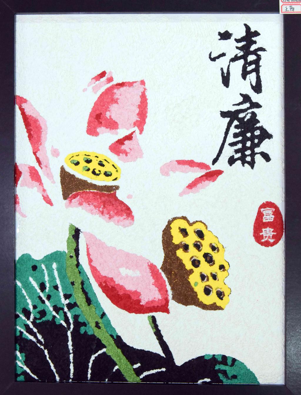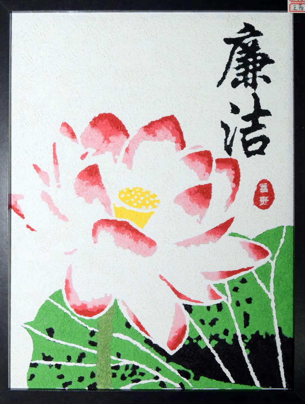 本作品以传统纸浆画形式,以巧妙构思将莲花、清廉等元素融入画面,通过天然材质与极简构图诠释"莲"与"廉"的精神共鸣。以层层堆叠的纸浆塑造高洁莲花,用艺术美感传递廉洁清正价值观,让观众在欣赏画作时,潜移默化接受廉洁文化洗礼。(作者 王茜、国帅)