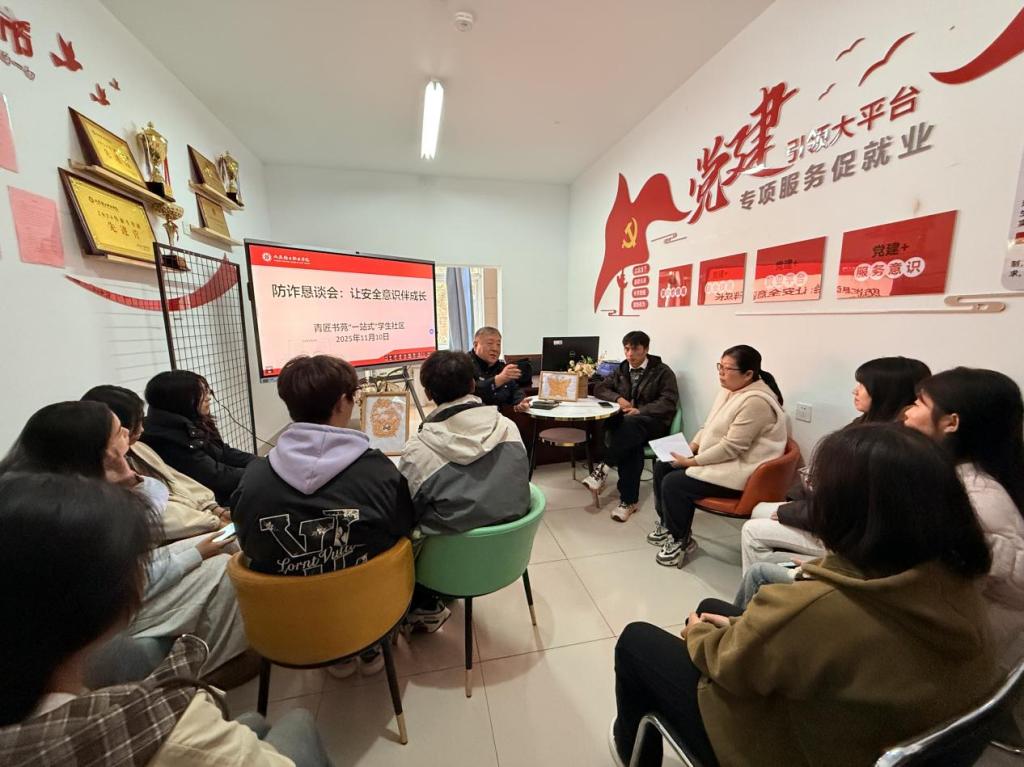 “同学们,‘客服主动退款’听着暖心?小心是骗子挖好的‘甜蜜陷阱’!”近日,青匠书苑“一站式”学生社区里暖意与笑声交织,一场打破常规的防诈骗知识恳谈会热闹开讲。社区特邀辖区民警走进校园,以“零距离对话”的形式,为学生代表们送上既含“干货”又有“温度”的防诈“安全指南”。