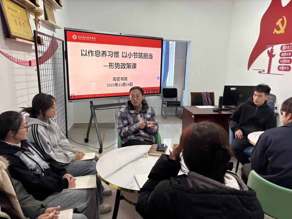 近日,工商管理系党总支书记以“宿舍作息里的成长密码”为切入点,为青匠书苑“一站式”学生社区学子带来一堂别开生面的形势政策课,将宏大叙事融入日常点滴,引发学子深度思考。