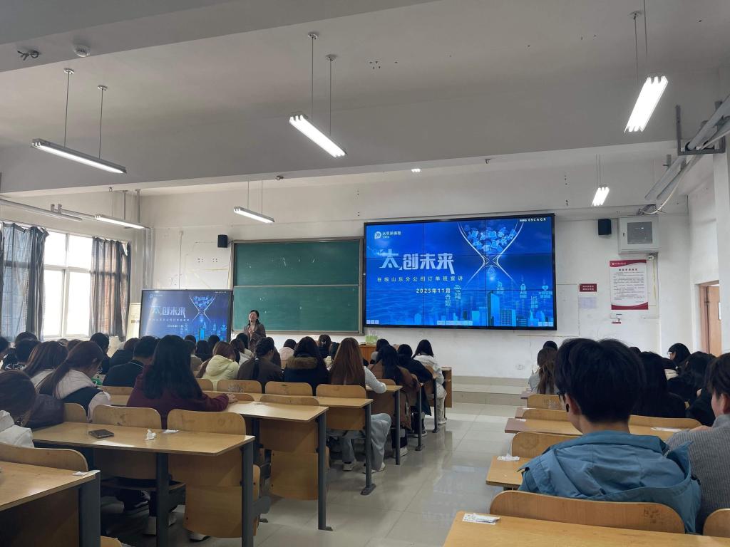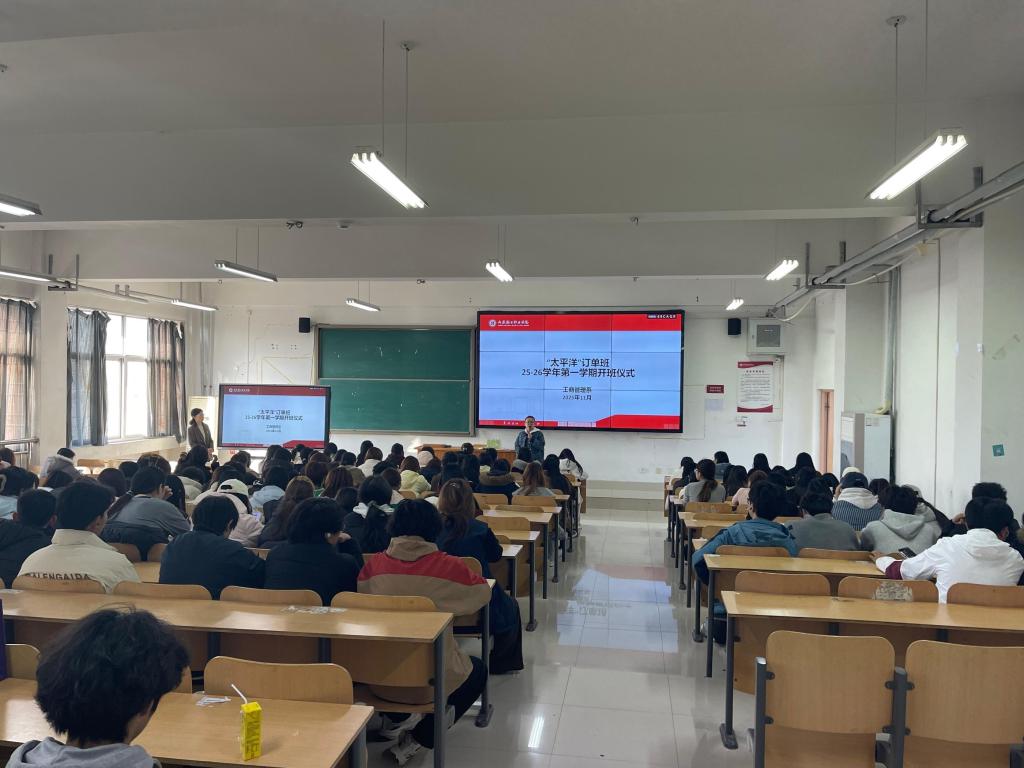 11月13日,工商管理系与太平洋保险在线服务科技有限公司山东分公司在J7505举行“太平洋”订单班2025-2026-1学期开课仪式,太平洋保险在线服务科技有限公司山东分公司人事经理刘田田、袁辉赞,订单班班主任陈贻韬、教师付津赫及2025级学生代表参加。